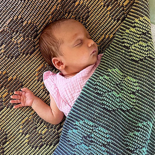 Babydeken 'Bloem', wat in het Nederlands 'Bloem' betekent. Waarom ik haar Bloem heb genoemd, is wellicht duidelijk. Deze deken, in een ideaal babyformaat van 95 x 65 centimeter, is gehaakt met de illusietechniek. Dat betekent dat beide kanten even mooi zijn, maar de kleuren zijn omgekeerd. Het patroon legt uit hoe je deze techniek haakt.
