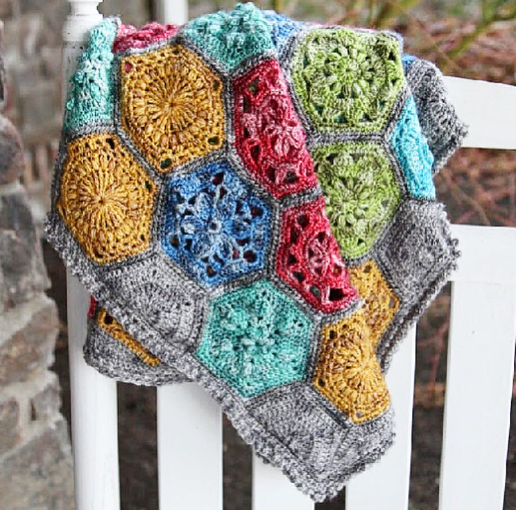 Het haakpatroon voor deze deken is verkrijgbaar via Rachele's blog Cypress Textiles, inBritse enAmerikaanse termen .